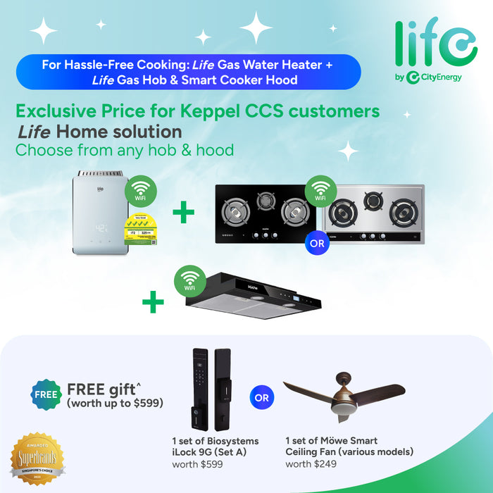 Life Hassle-Free Cooking Bundle: Life Smart Gas Water Heater (L10WFE) + Life Smart Gas Hob (Any 6 models) + Life Cooker Hood (L895H or L900H) & FREE GWP Options